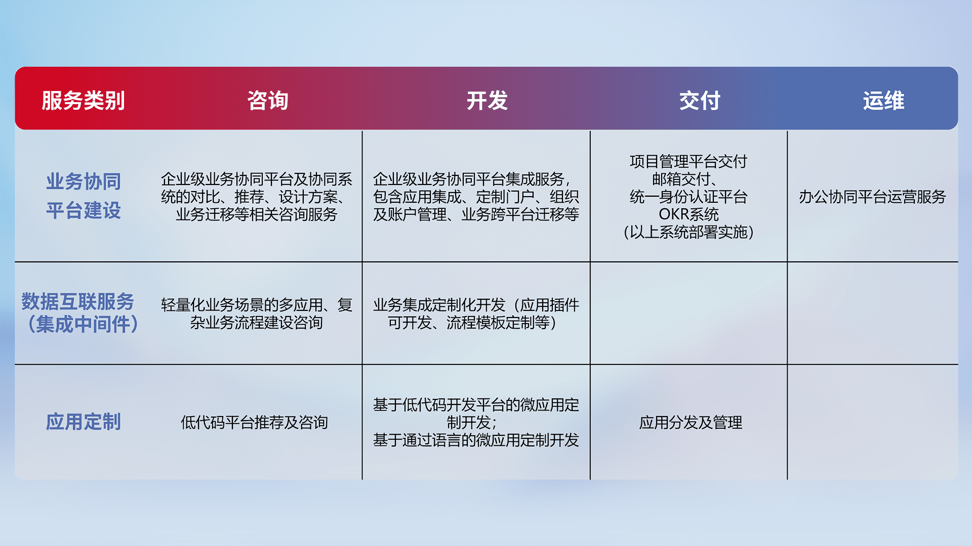 针对钉钉、、、企微、、、IDaas等平台级产品提供产品的规划、、方案、、、交付、、定制化开发等服务,,,,实现如统一协同办公、、智能客户服务、、、混合会议管理、、智能数据查询、、、、等业务场景,,,实现数字化转型。。